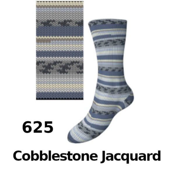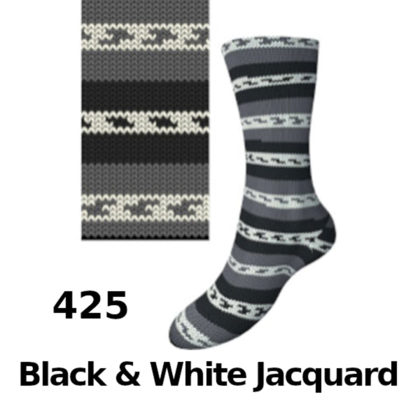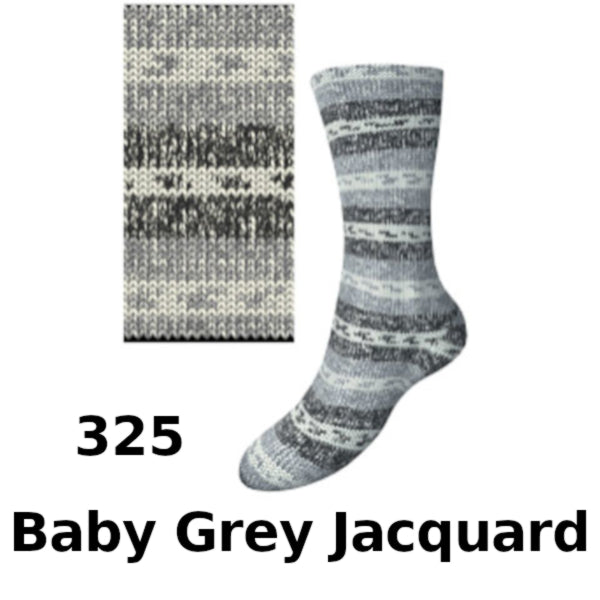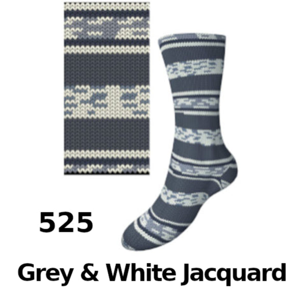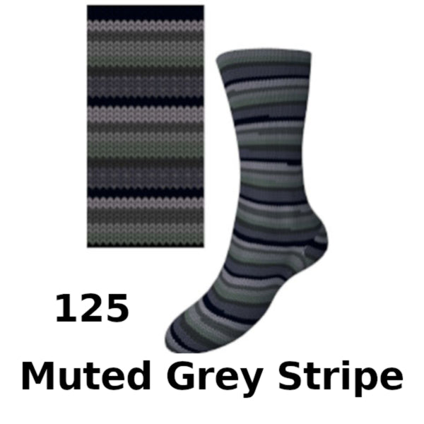 Comfort Wolle MY08 is a soft, self-patterning yarn creates colourful striped and pixel-style motifs against a range of modern grey-toned jacquard shades, perfect for subtle yet playful sock projects.