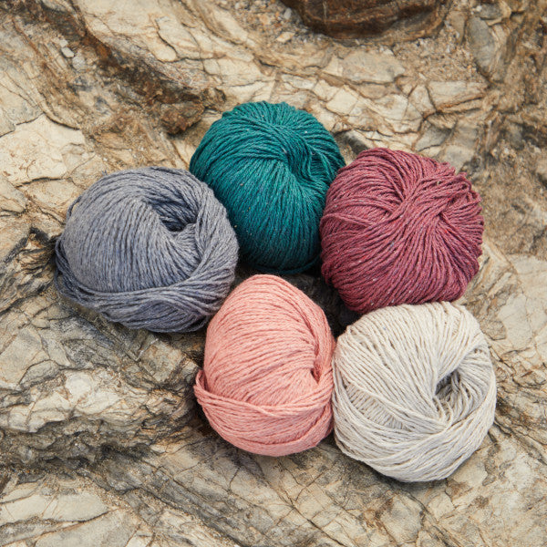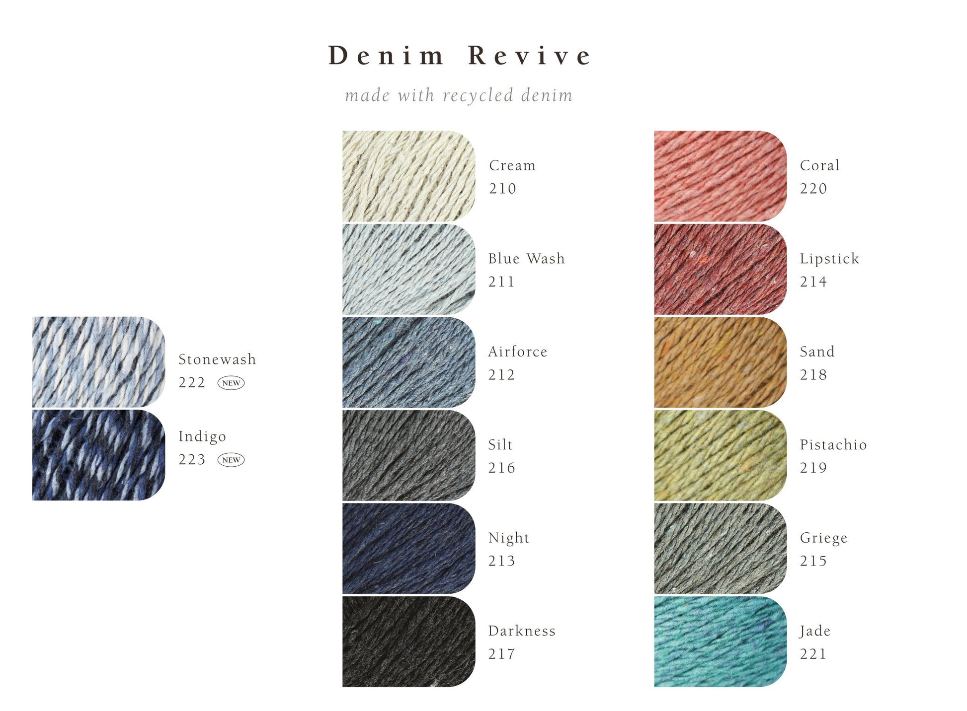 There is something so special about denim yarn, and Rowan Denim Revive has an added dimension, thanks to its sustainable credentials. Made from recycled cotton fibres that give Denim Revive an almost tweedy effect, the capsule colour palette of muted shades contains the classic denim shades but goes beyond the blues to include chalky white, soft red, and midnight black. A perfect choice for lace, cables, or even a traditional gansey.