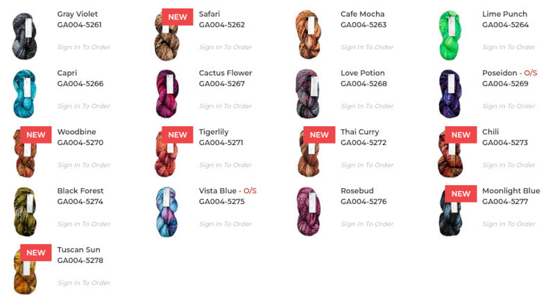 Because there are no dye lots, we recommend buying enough yarn to complete a project. To achieve an overall blended effect, knit two rows from one skein and then two rows from another.