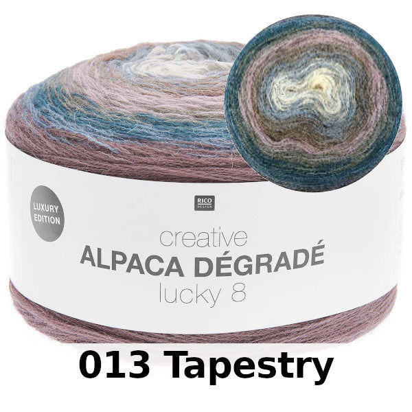 Eight colors are represented in each ball of Creative Alpaca Dégradé Lucky 8, which, when knitted, results in super-beautiful color gradients with the delicate halo of alpaca.