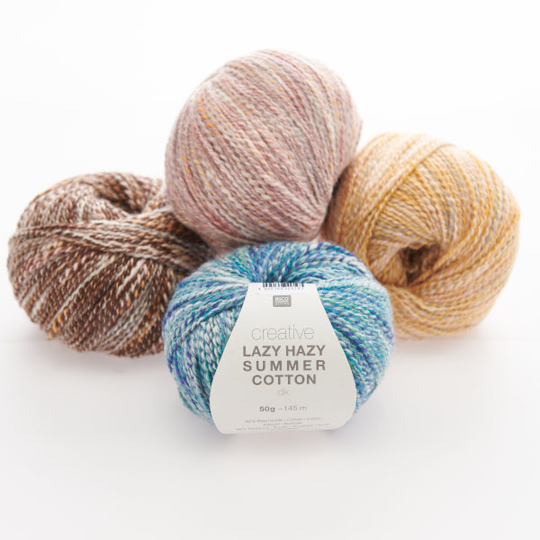 Rico Creative Lazy Hazy Summer Cotton DK is a special yarn which has a solid core colour wrapped with an additional print coloured thread. This twisted thread looks absolutely stunning in knitted clothes or accessories. The yarn is available in a range of shades from pastels to bright bold colours.