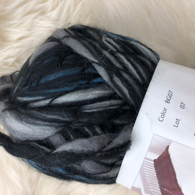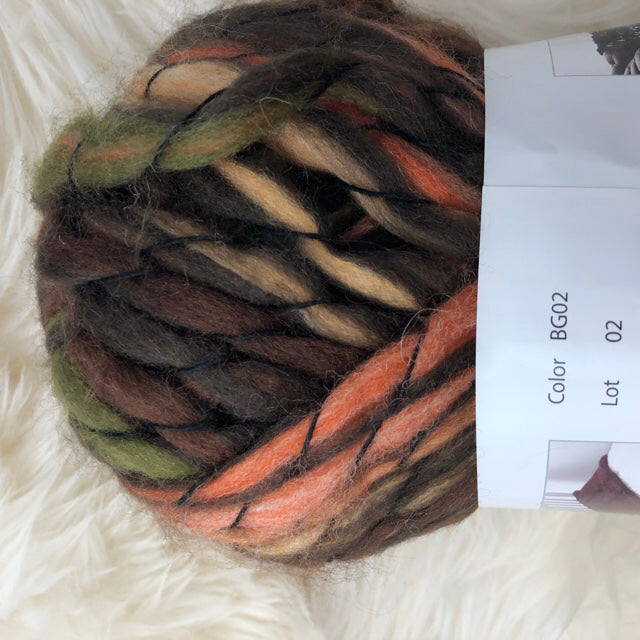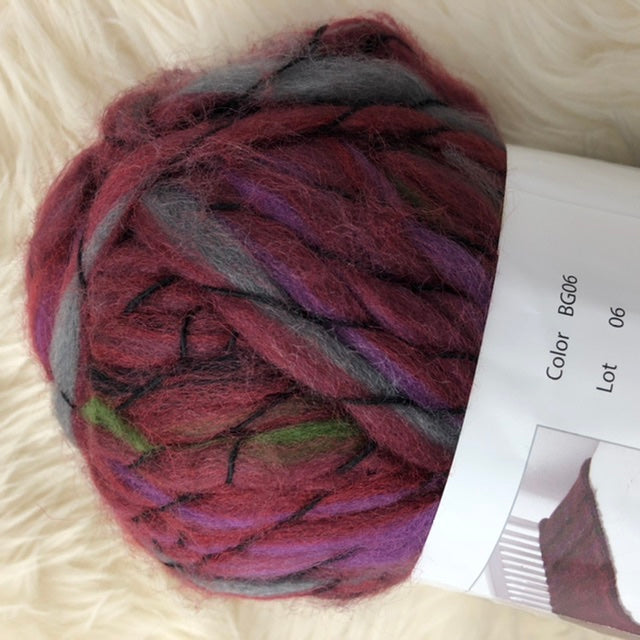 Super bulky acrylic-wool blend roving type yarn, stabilized with black thread.